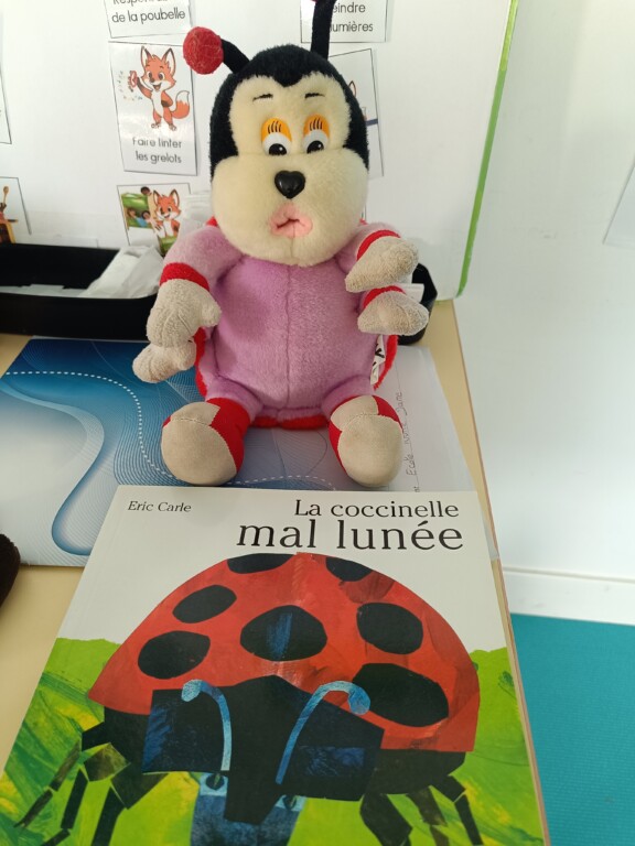 Lundi, nous avons reçu un colis…à l’intérieur des larves de coccinelles, une mascotte coccinelle et un album.