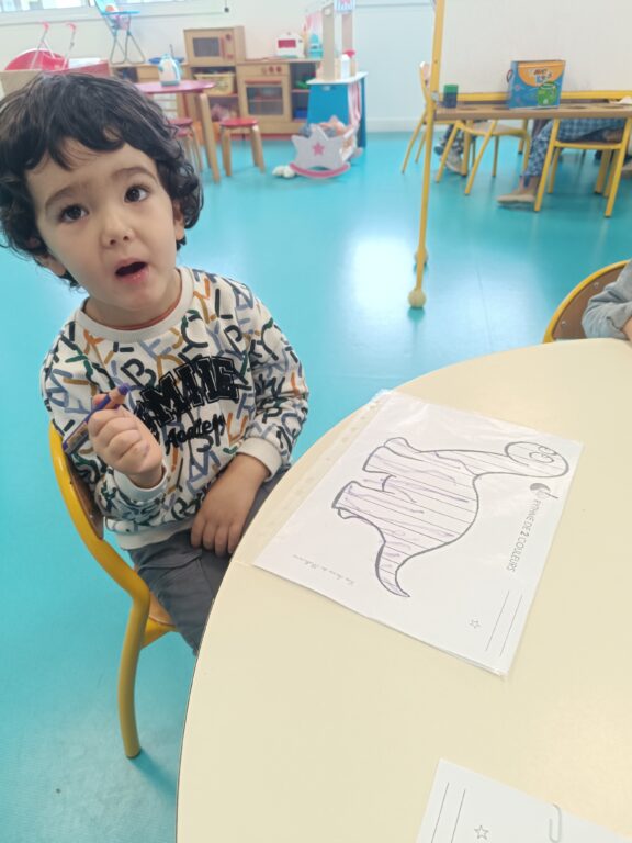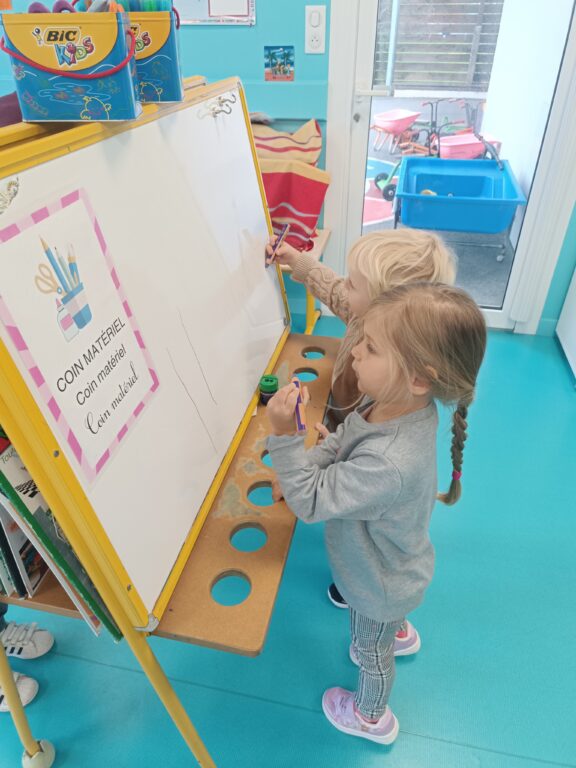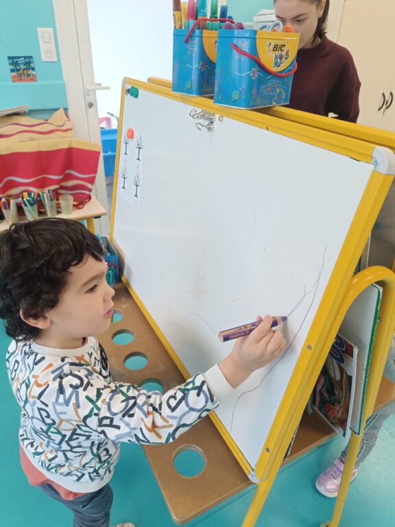 Ce matin, au programme, verticales sur le tableau puis sur table pour faire les piquants du hérisson ou les bandes de POP, l’ami du hérisson.