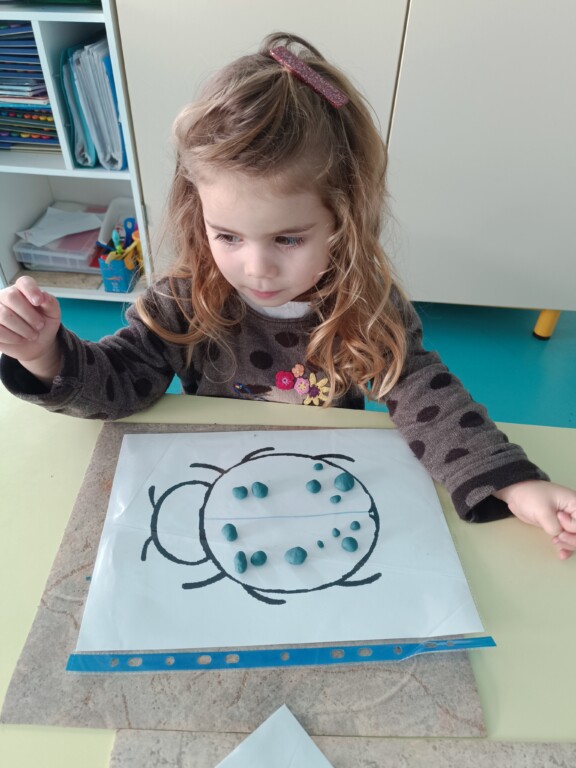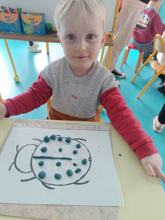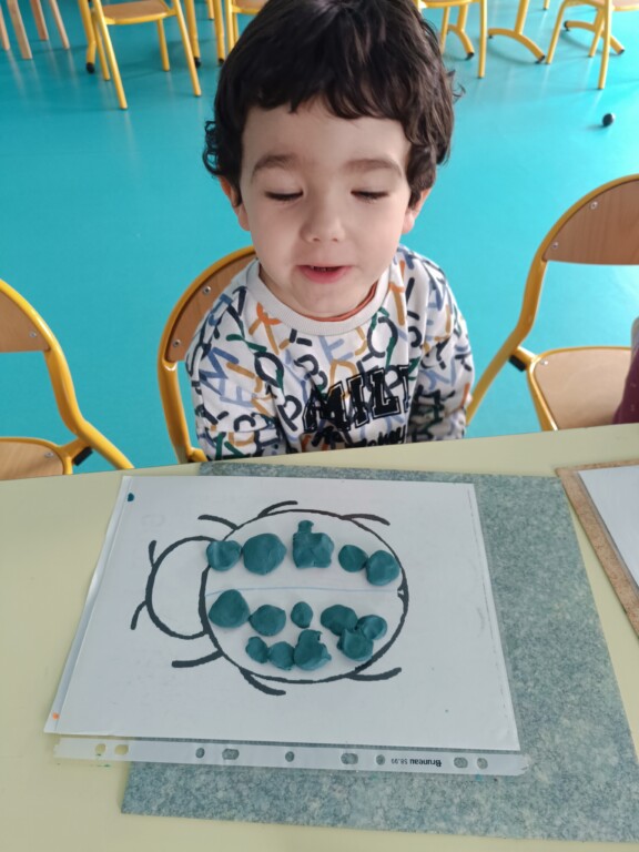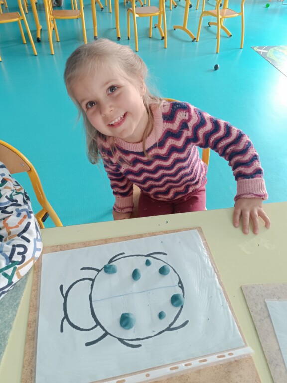 objectifs : faire des boules de pates à modeler et les disposer sur le dos de la coccinelle de manière “organisée” ( notion d’autant”).