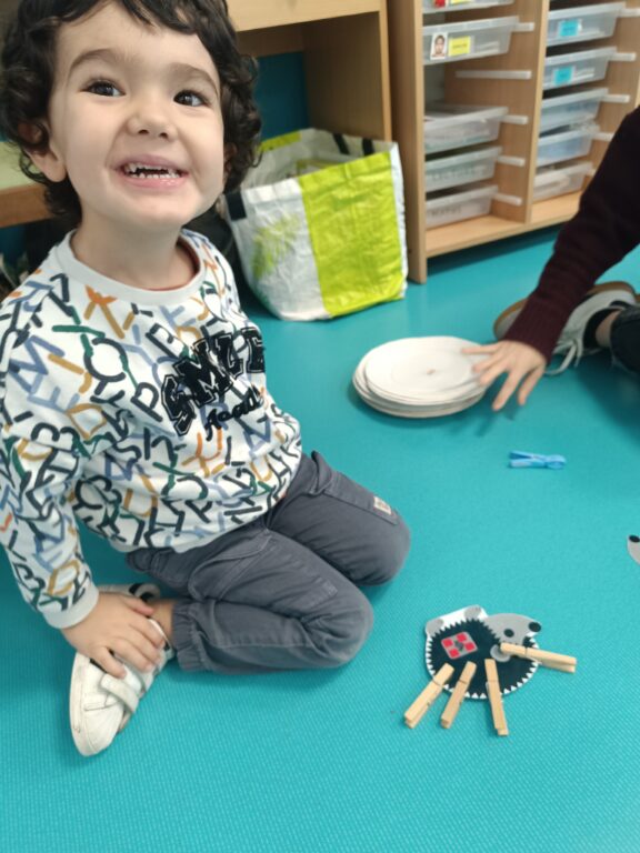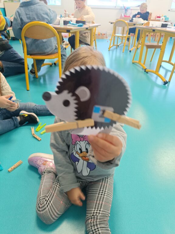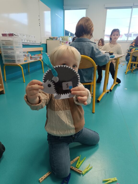 Dans un second temps, il fallait mettre le bon nombre de pinces sur hérisson ( dénombrer la collection de gommettes puis associer autant d’épingles à linge).